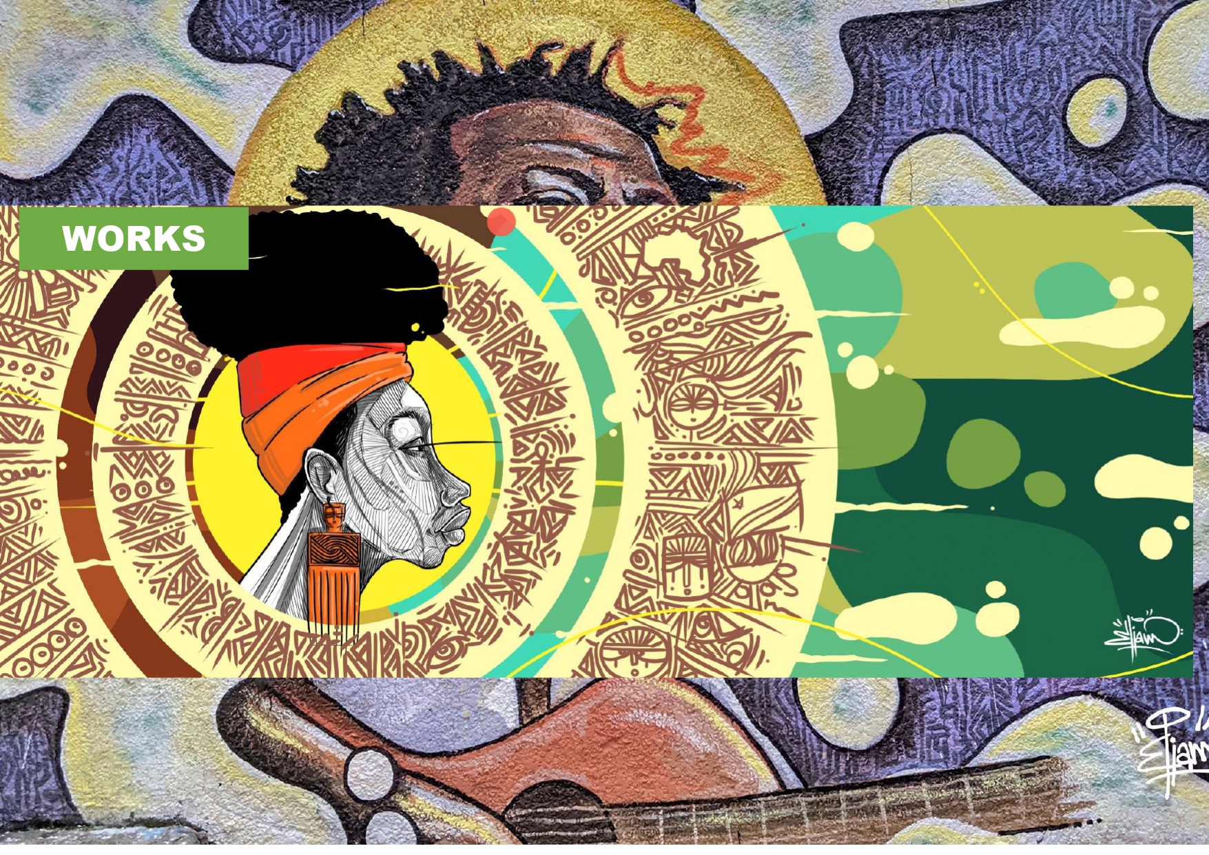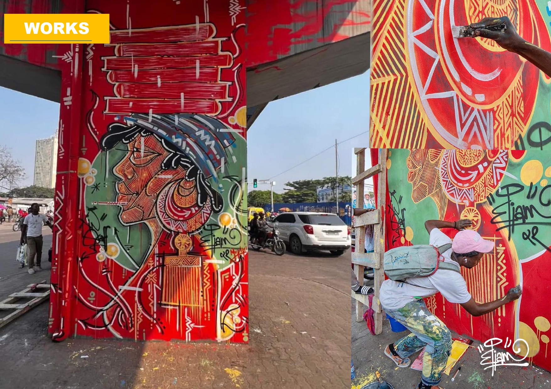 Through bold patterns and ancestral symbols, Eliam seeks to revive African heritage in the modern urban landscape. His work bridges tradition and contemporary life, inviting viewers on a journey between dream and reality, past and present.